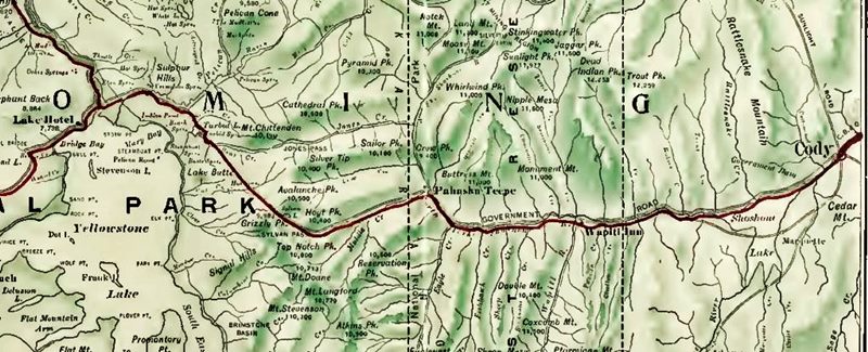 1907 Map of route from Cody, Wyoming to Lake Hotel in Yellowstone. The road passes through Waiti Valley to Pahaska, and then up over Sylvan Pass, and down the mountain to Lake Hotel. At the hotel one could choose to take the coaches of the Yellowstone Park Transportation Co. or of the Wylie Permanent Camping Co.